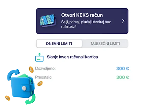 KEKS račun je prepaid račun koji možete jednostavno dopuniti preko aplikacije KEKS Pay. Besplatno štedite, plaćajte, primajte i podižite novac s KEKS računa.